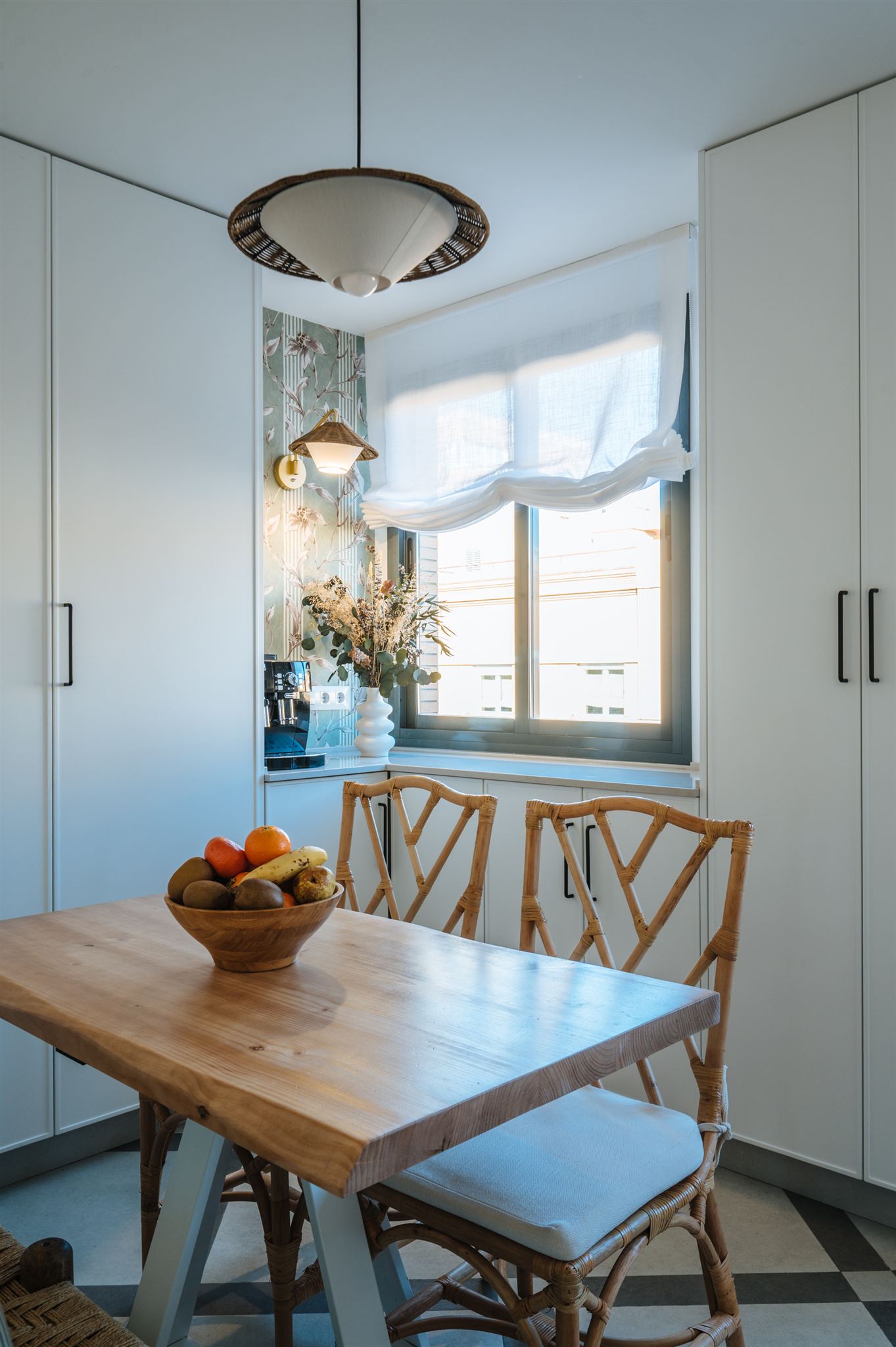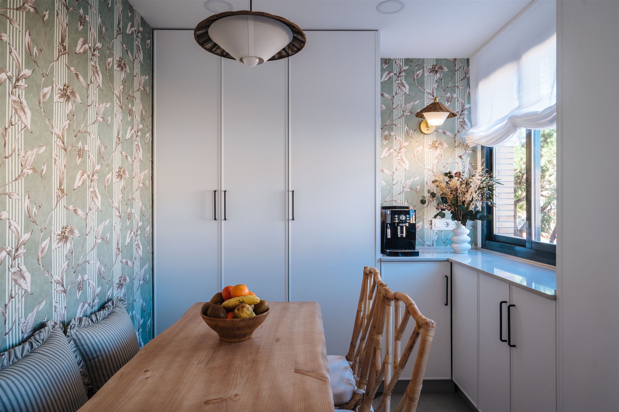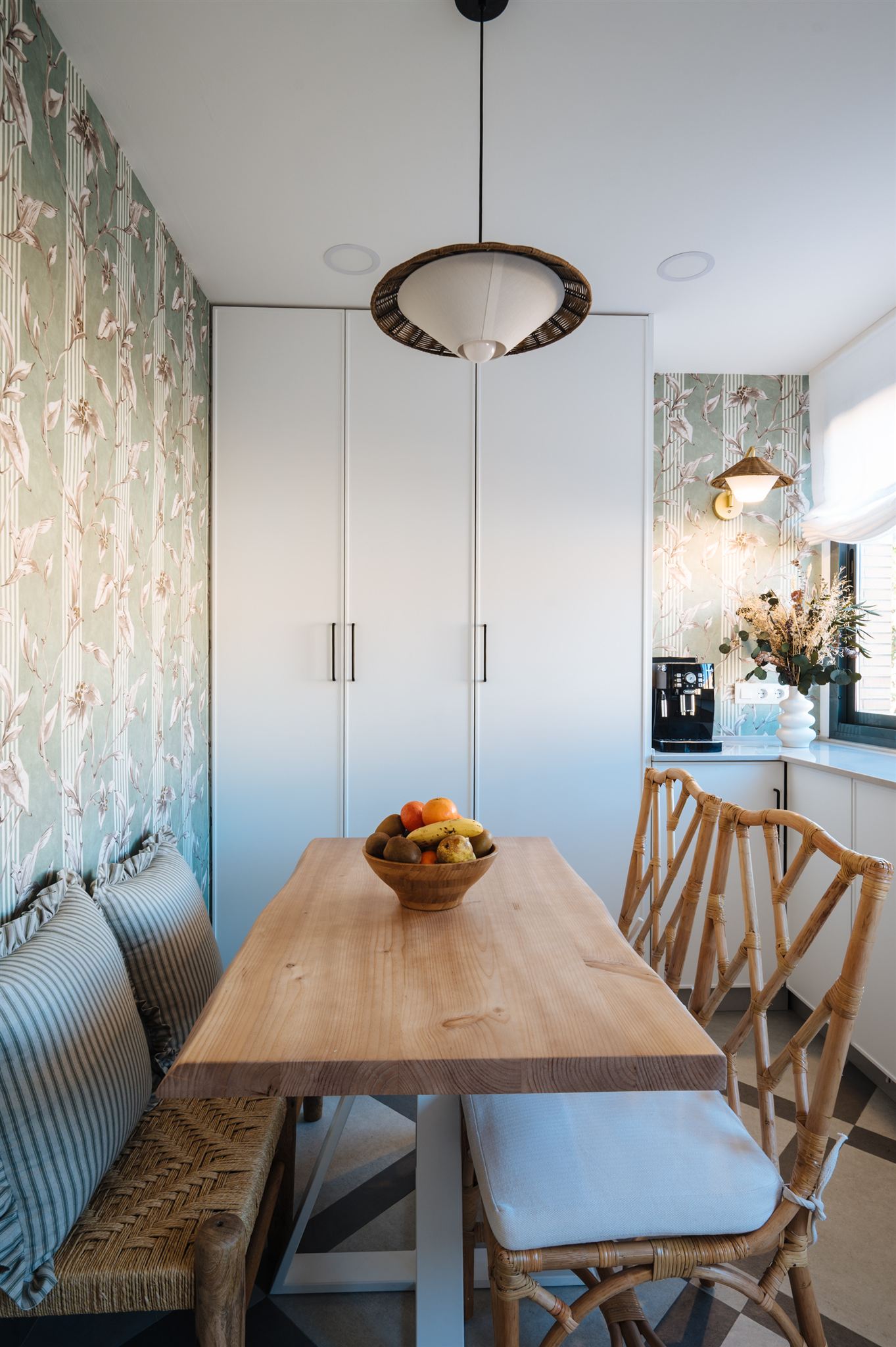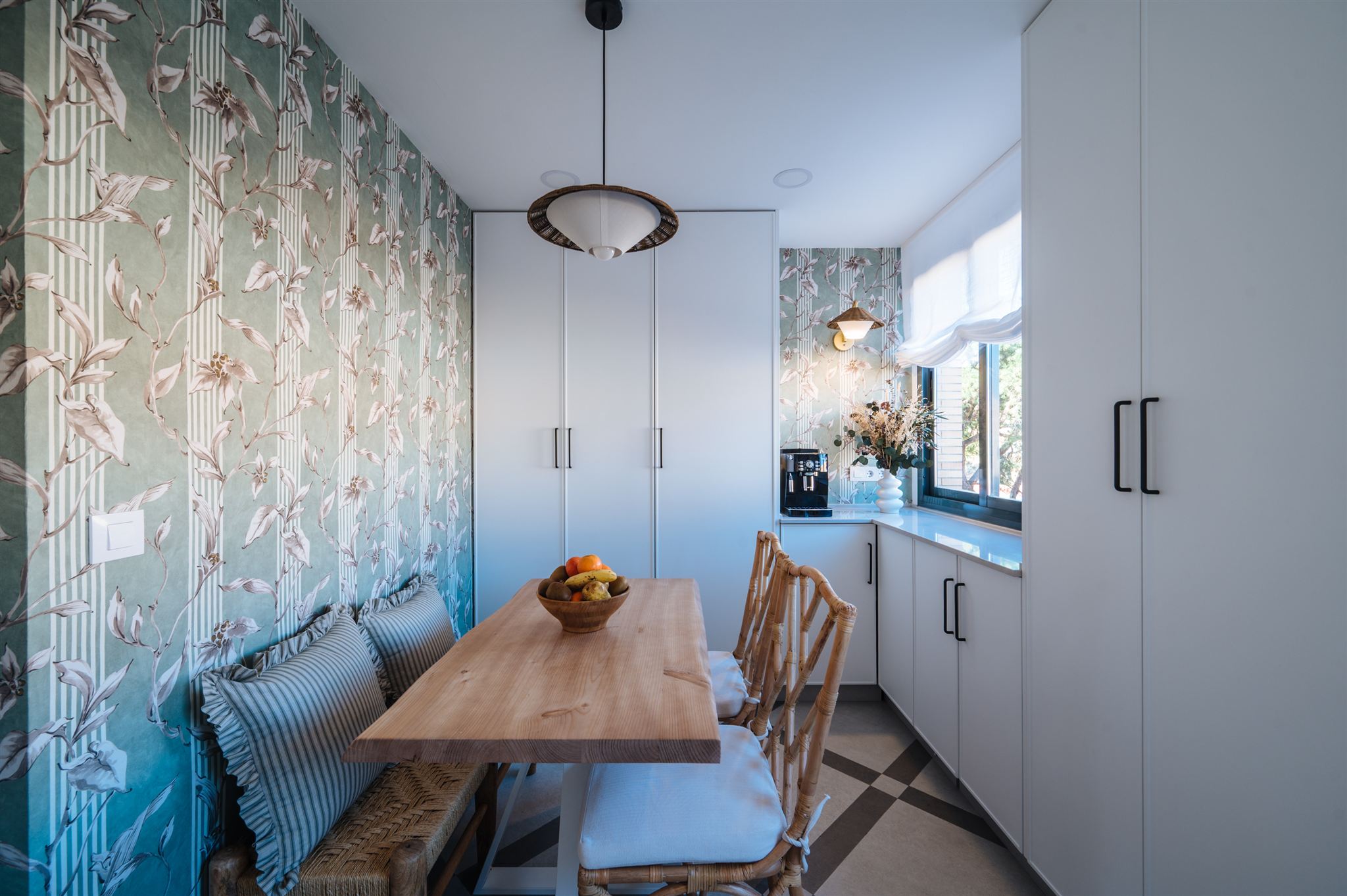Decidimos diseñar una cocina con tonalidades que generaran mucha amplitud, seleccionamos un papel llamativo y diseñamos una solería a dos tonos para darle un toque de mayor personalidad. La calidez la aportamos con los toques en madera natural, fibras naturales y bambú.