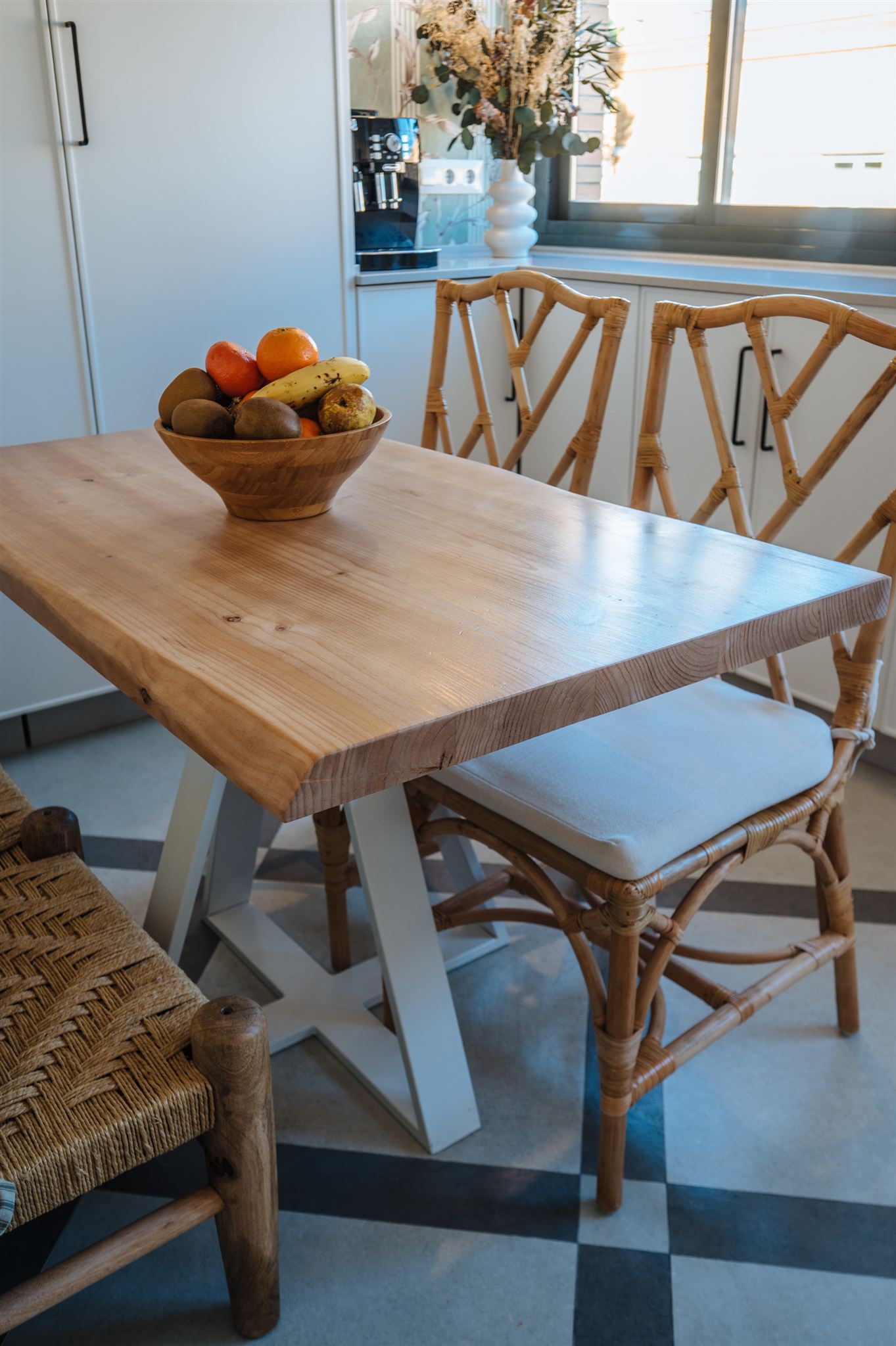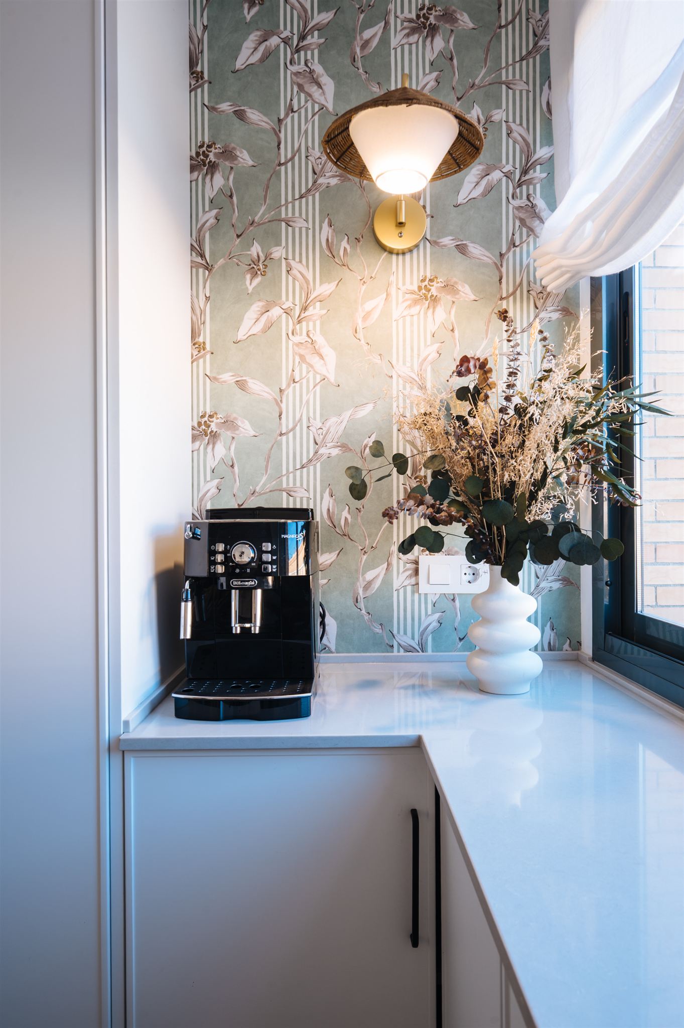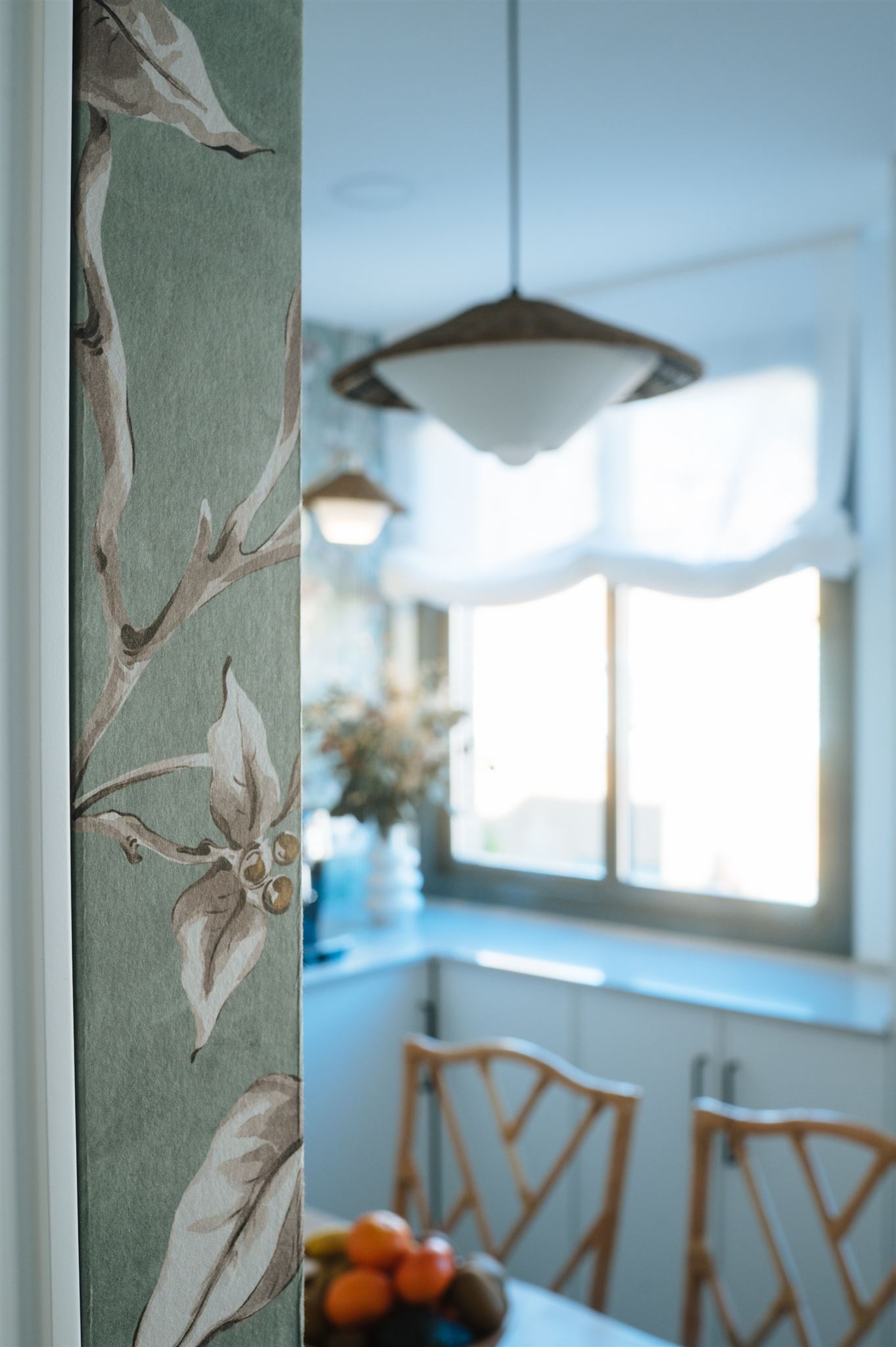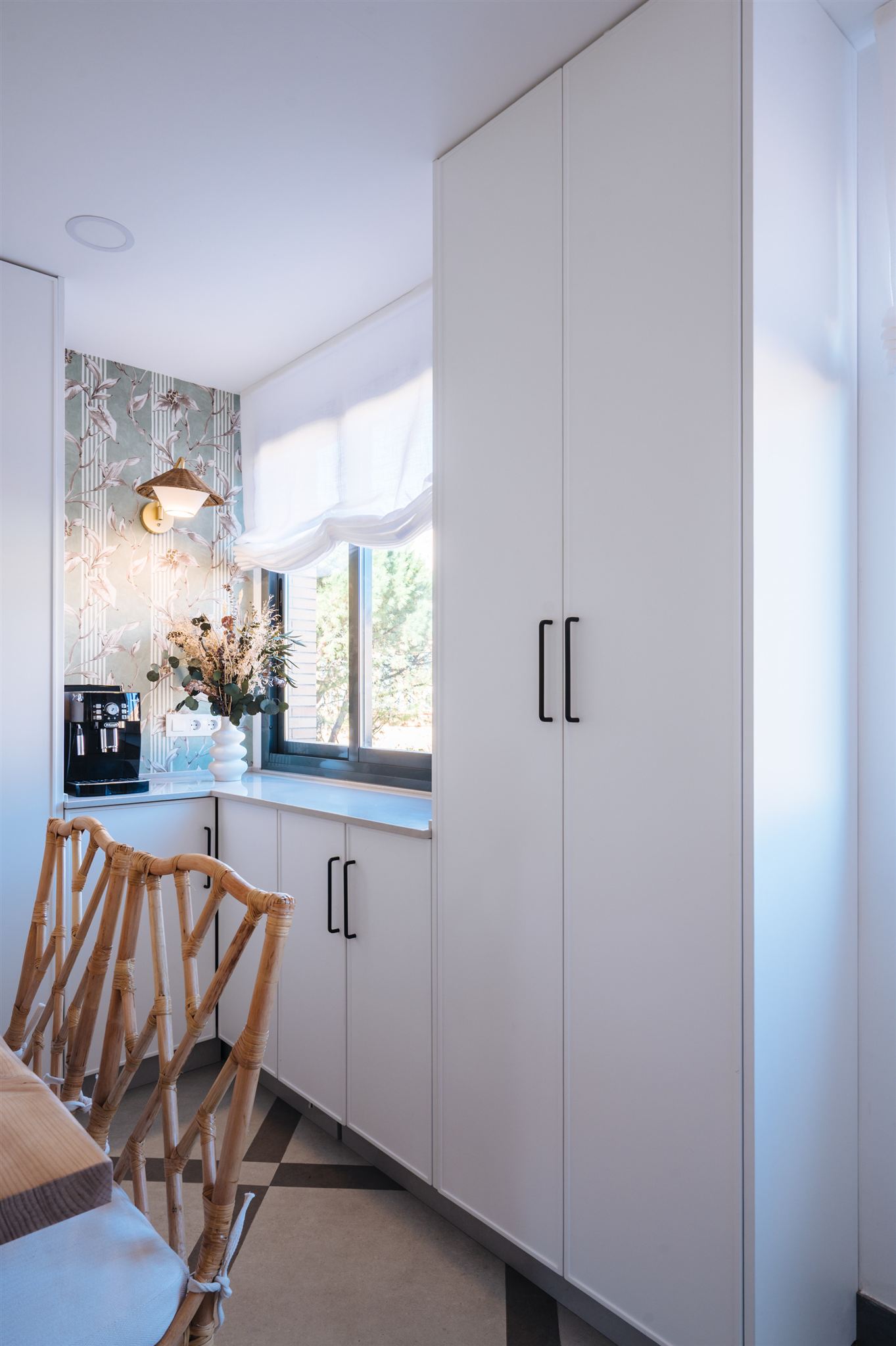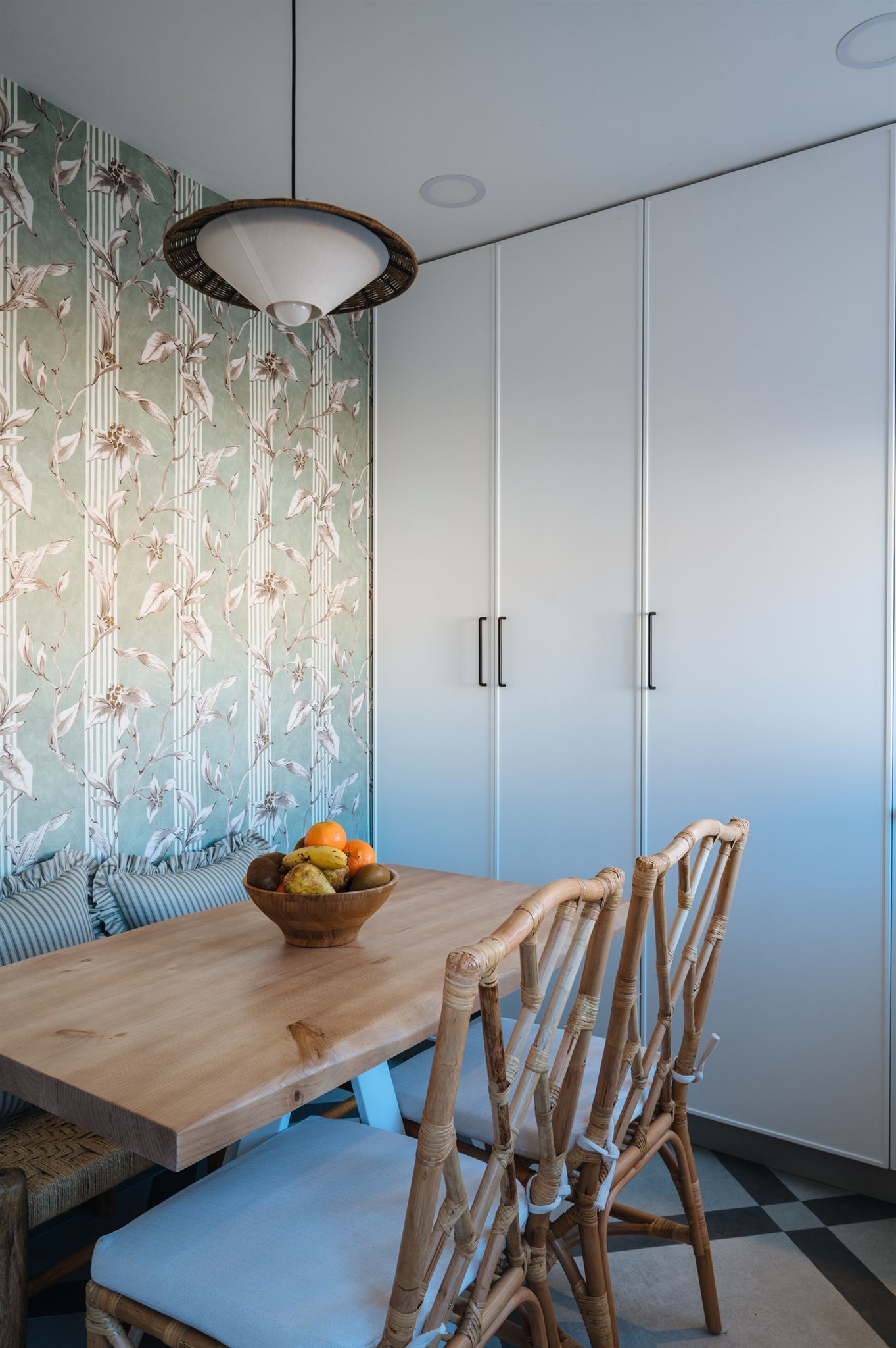Decidimos diseñar una cocina con tonalidades que generaran mucha amplitud, seleccionamos un papel llamativo y diseñamos una solería a dos tonos para darle un toque de mayor personalidad. La calidez la aportamos con los toques en madera natural, fibras naturales y bambú.