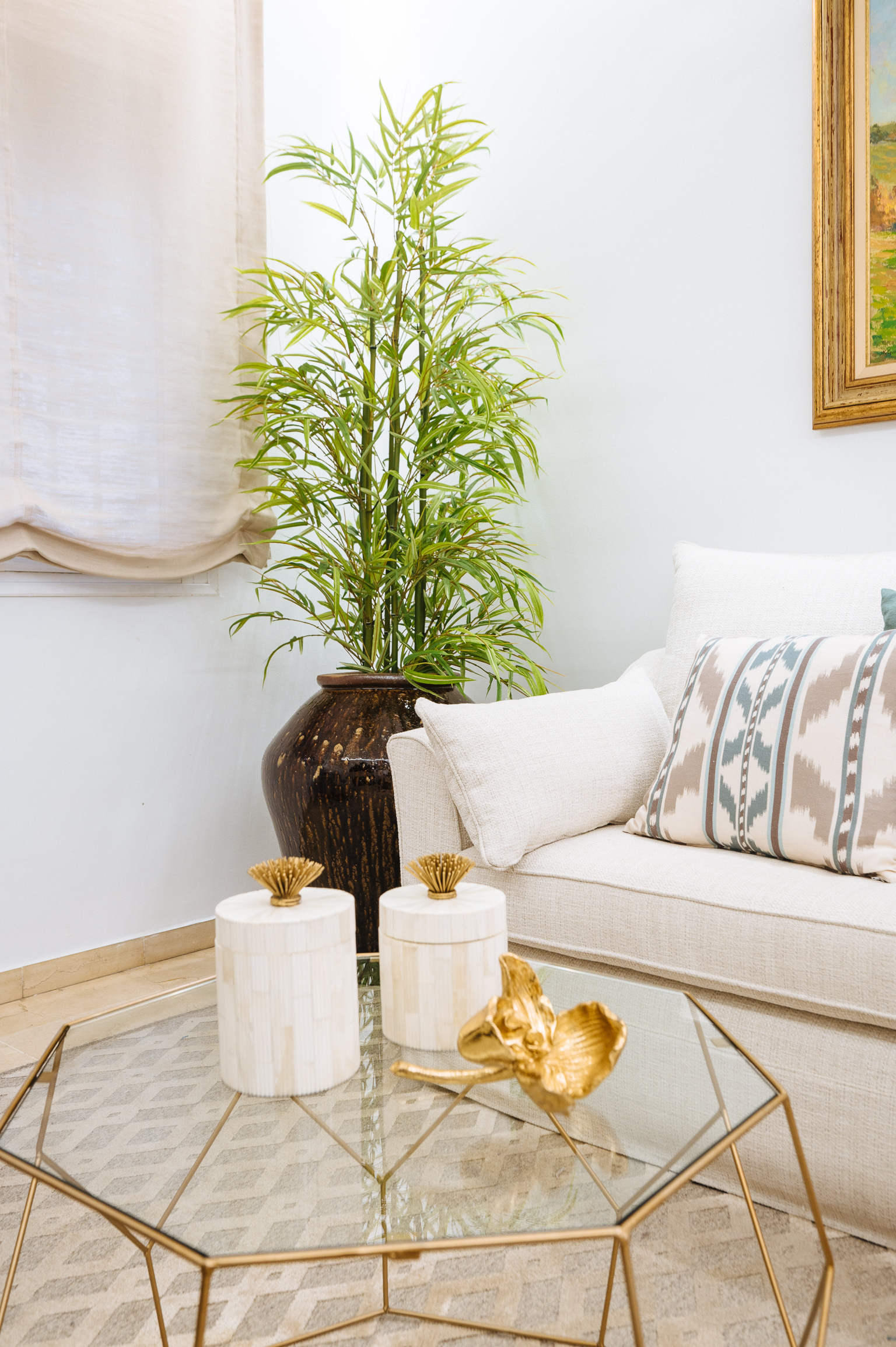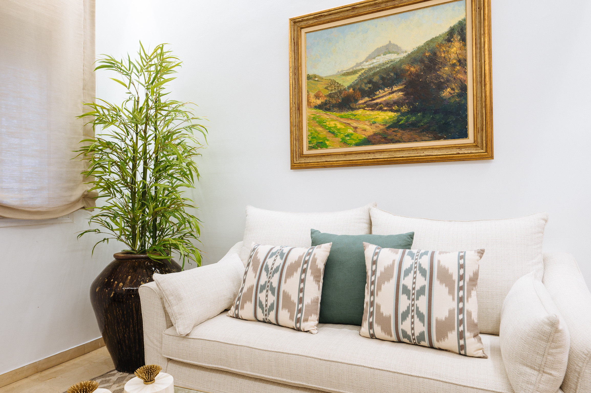 Modificamos la distribución del espacio, le dimos una segunda vida al mobiliario que merecía la pena, reestructuramos la ubicación de los cuadros, incluimos diferentes artículos de decoración, textiles, lámparas decorativas y un diseño de un nuevo sofá.