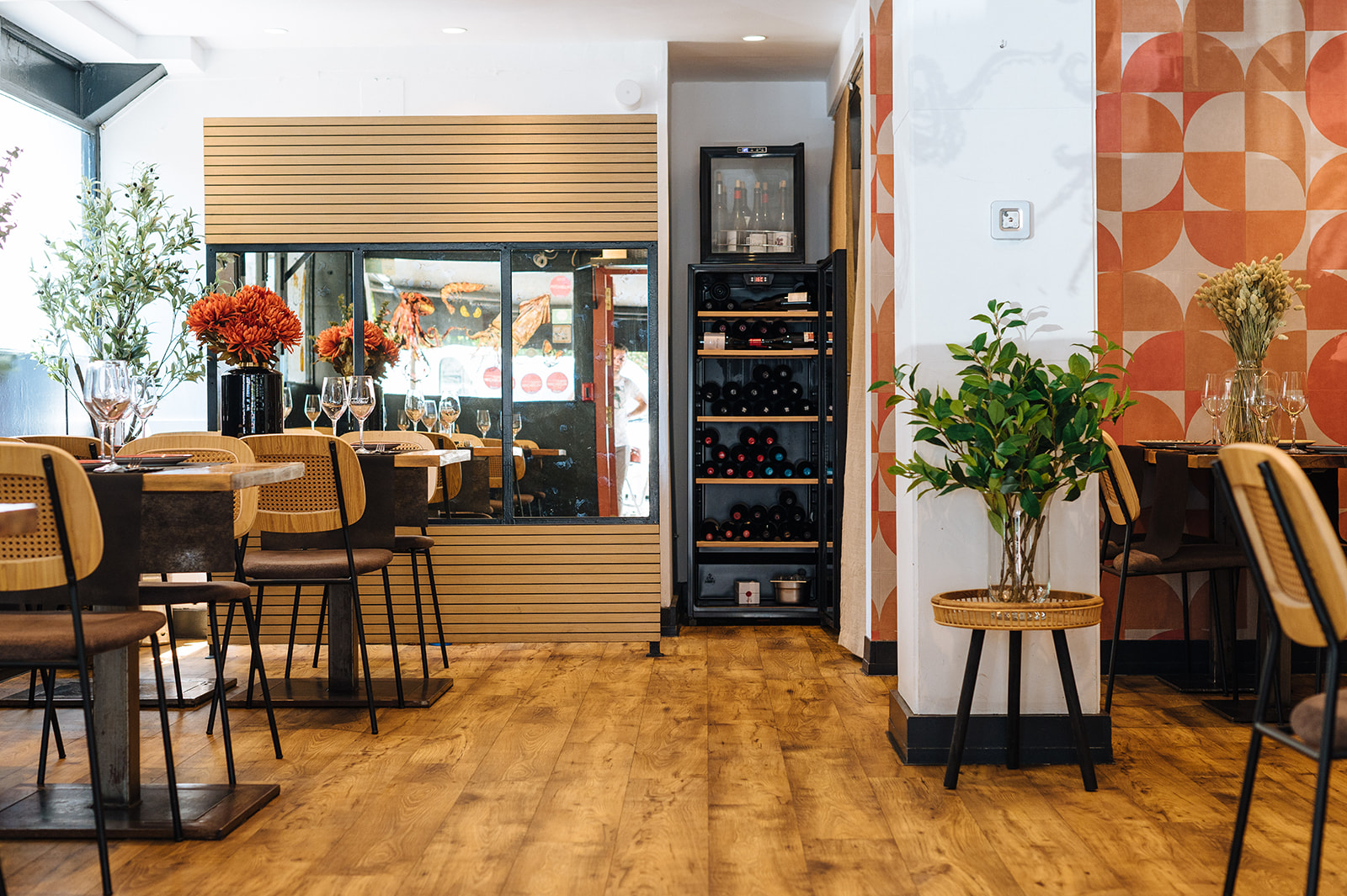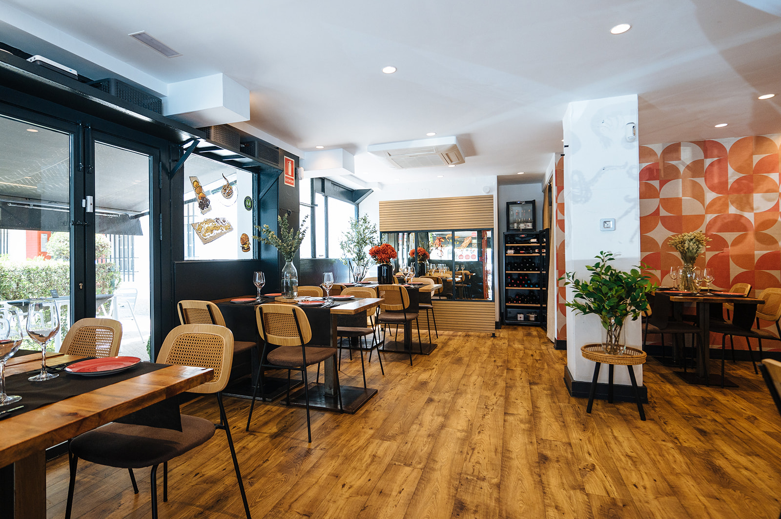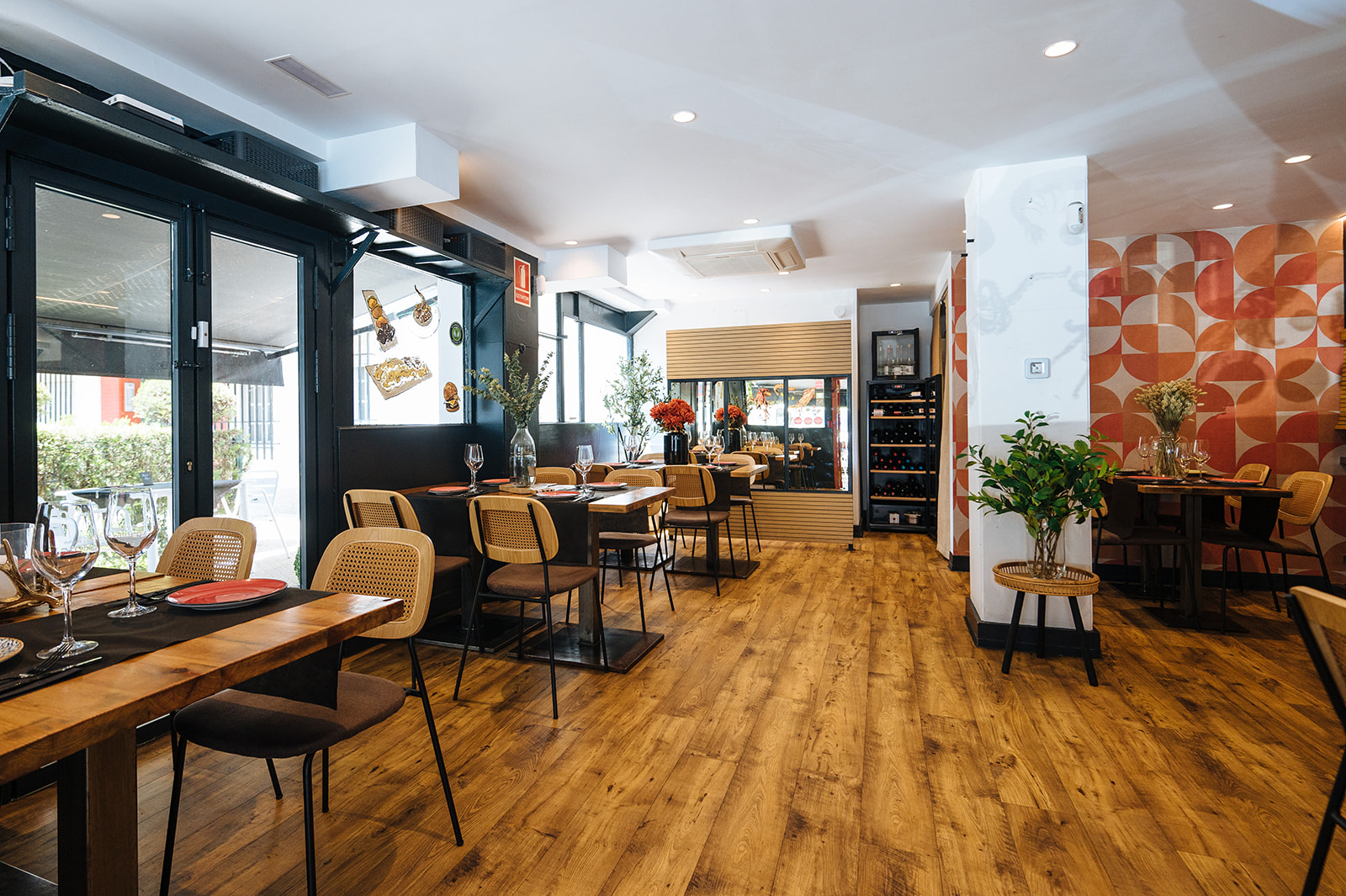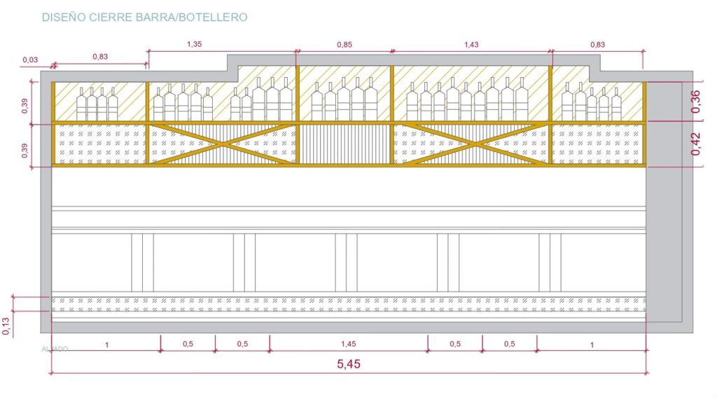 Realizamos un proyecto de interiorismo y de decoración en el que cambiamos la instalación eléctrica, demolimos el techo actual, saneamos instalaciones, revestimos paredes con papel y pintura, renovamos la fachada con un cambio de color, cambiamos el suelo actual del local por un vinílico imitación a madera, realizamos un diseño nuevo de botellero integrando la actual barra, diseñamos un separador de ambiente, pintamos las puertas del paso del color de la imagen corporativa de la marca, seleccionamos diferentes elementos decorativos, luminarias y mobiliario.