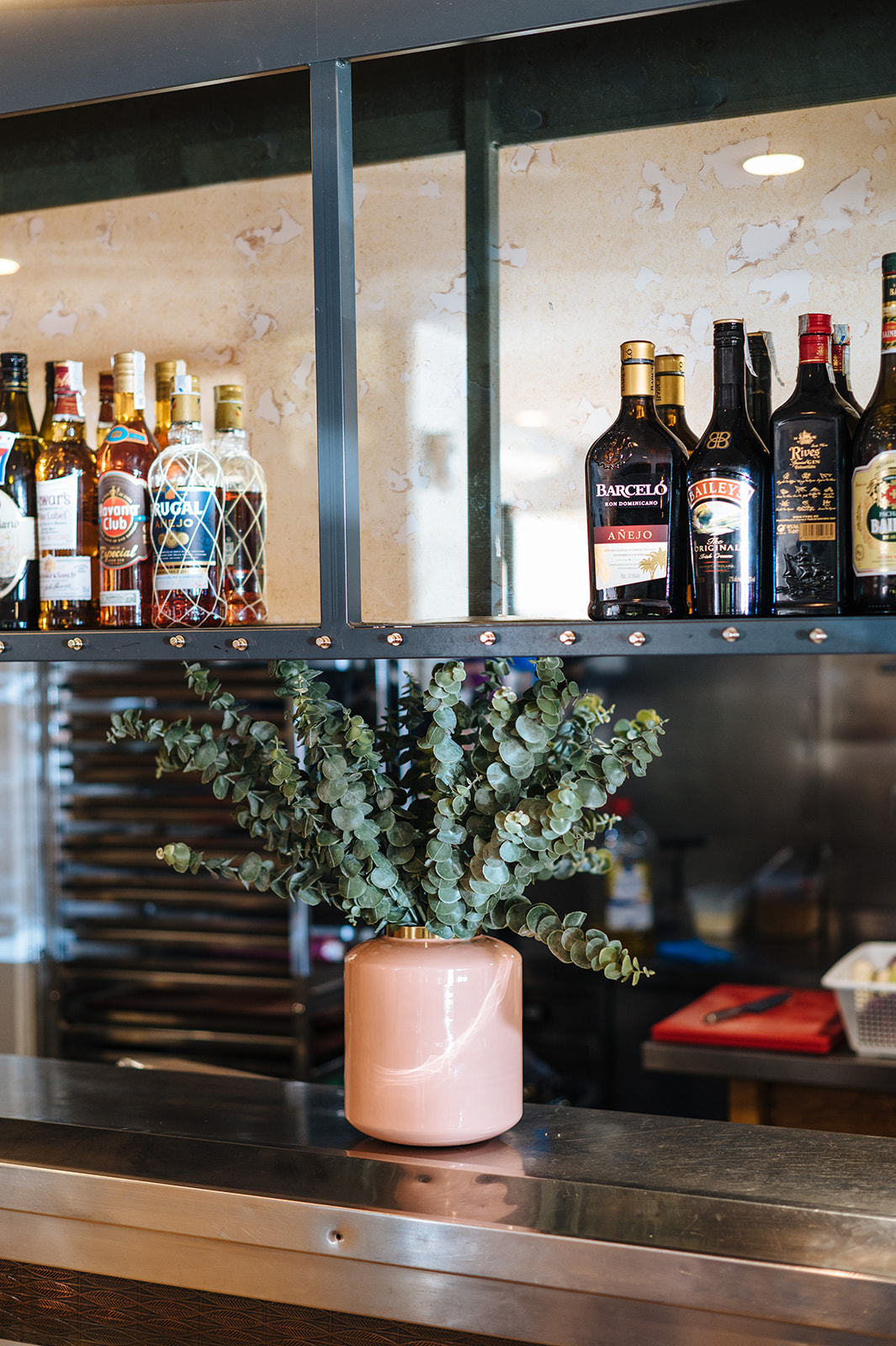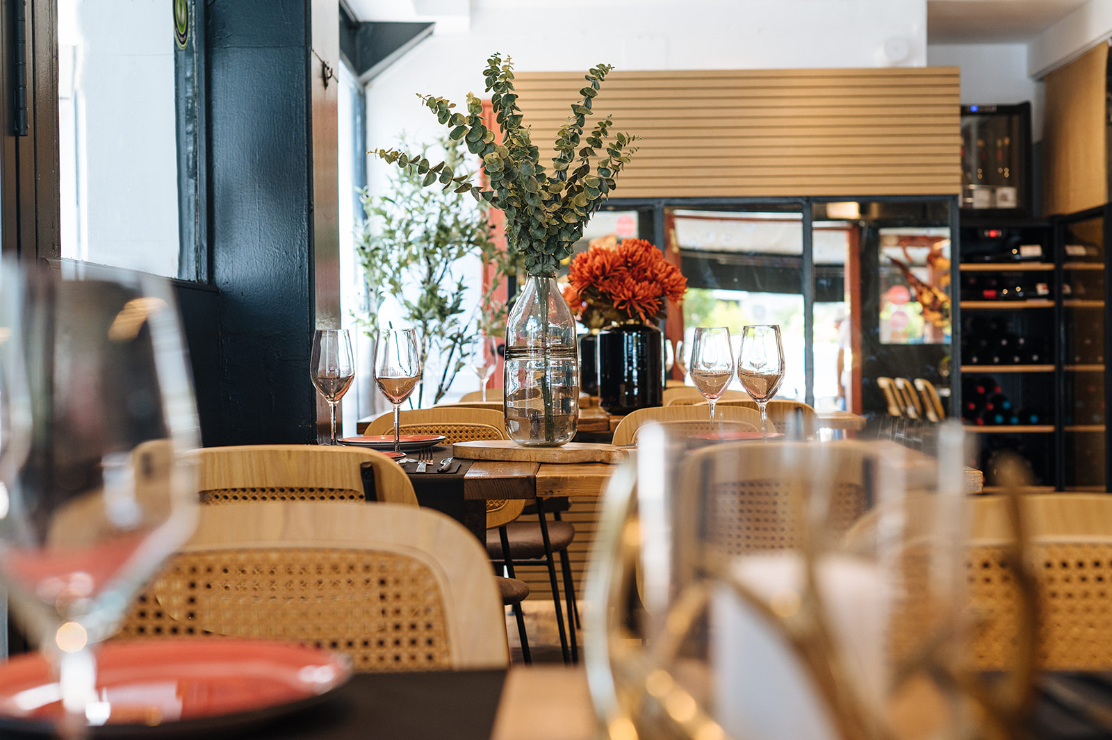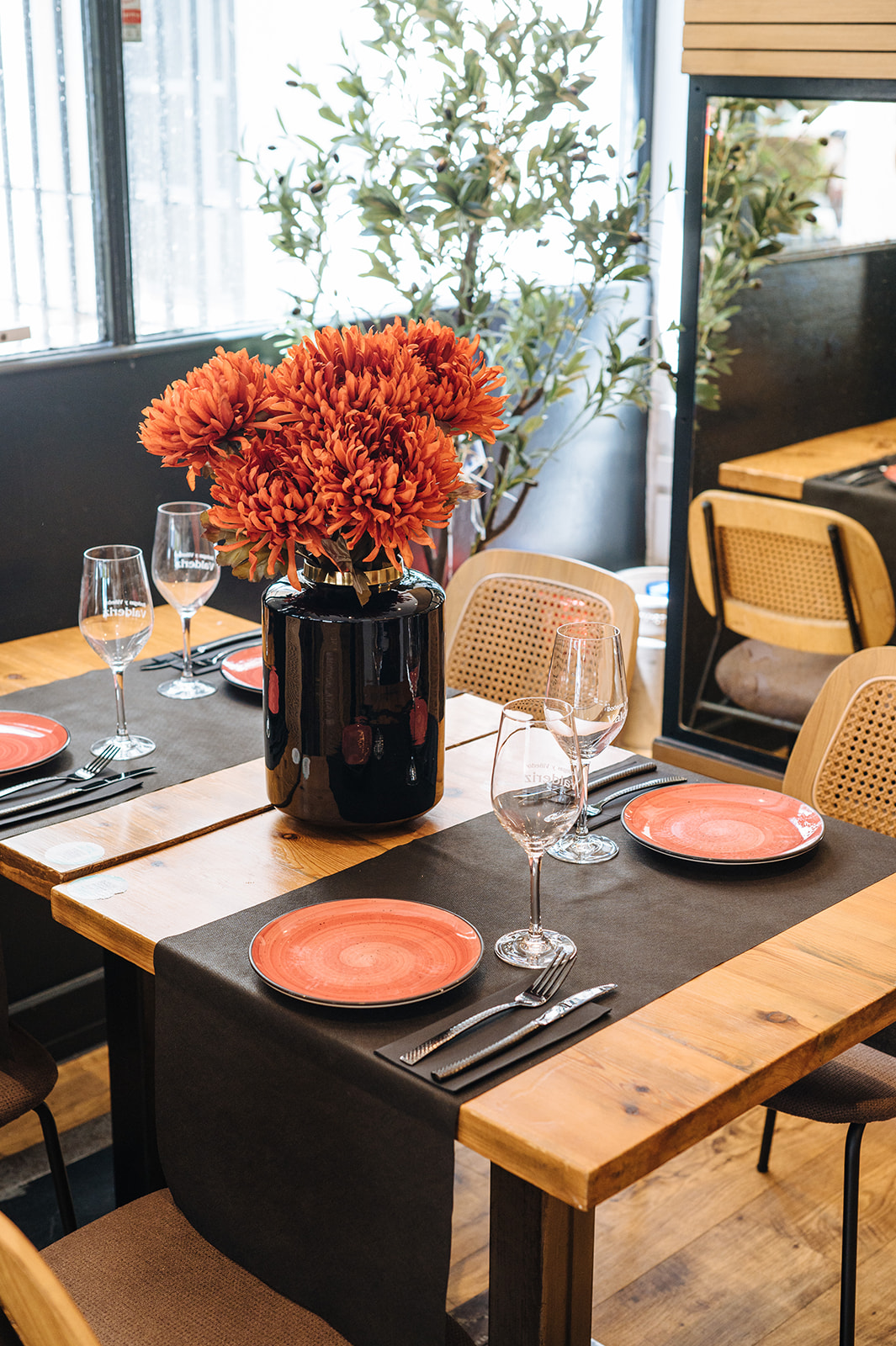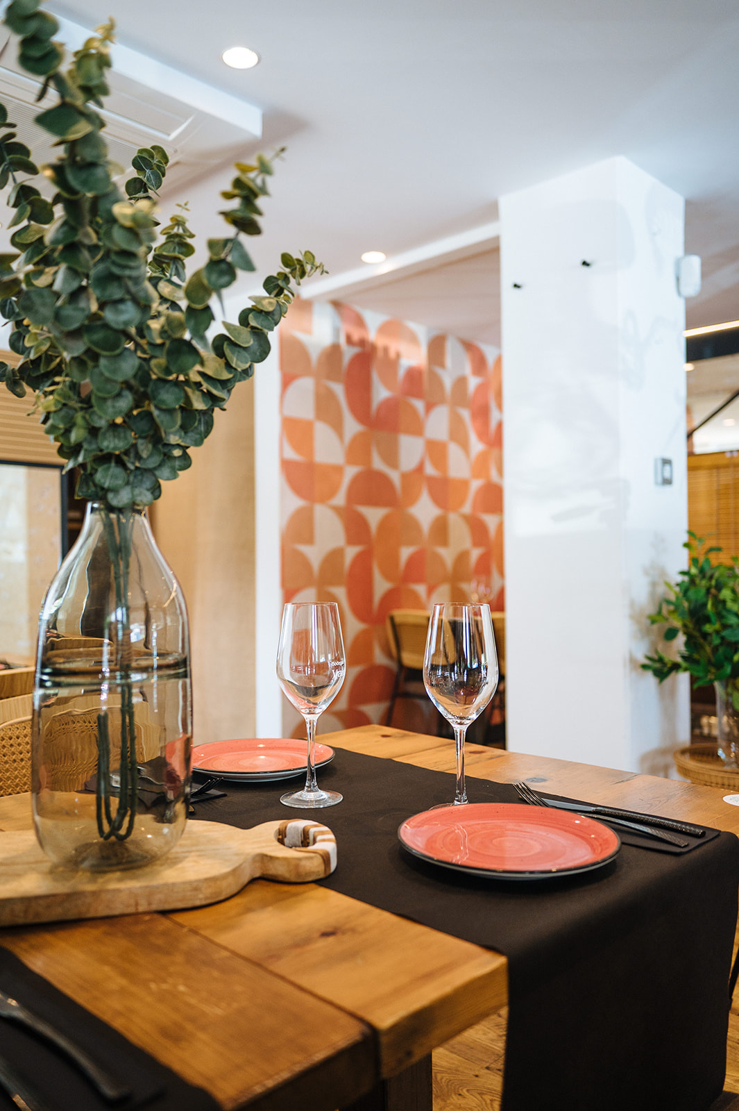 Realizamos un proyecto de interiorismo y de decoración en el que cambiamos la instalación eléctrica, demolimos el techo actual, saneamos instalaciones, revestimos paredes con papel y pintura, renovamos la fachada con un cambio de color, cambiamos el suelo actual del local por un vinílico imitación a madera, realizamos un diseño nuevo de botellero integrando la actual barra, diseñamos un separador de ambiente, pintamos las puertas del paso del color de la imagen corporativa de la marca, seleccionamos diferentes elementos decorativos, luminarias y mobiliario.